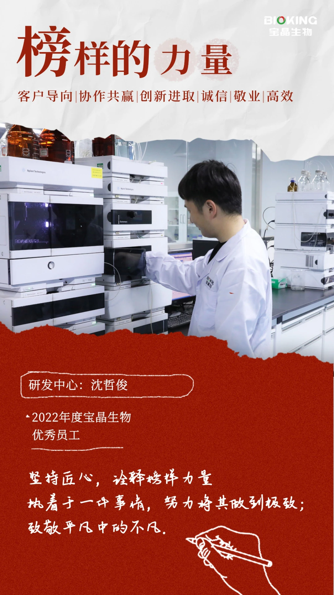 “兢兢业业,亦庄亦谐” 2021年2月,略显青涩的他以一名研发质检员入职宝晶,这份工作一做就是两年,这两年里他几乎没有出过差错。研发组长王静然说:“以前在学校时我也做过液相检测,我知道样品稀释的精准度对检测数据有很大的影响,需要检测者细致入微,也十分考验检测者的耐心,看似简单的工作,要做的好不出问题真的很难。”沈哲俊的工作是每天负责研发部门的样品以及生产过程中样品的检验工作。就是这样一件重复的事情,让沈哲俊找到了自己的价值。他说:“做一件事不难,但坚持做同一件事不简单,质检也不是简单的检测,它是产品品质的保障,是研发必不可少的流程。每次看到研发的需求被解决那一刻,就觉得自己所做的一切都非常有意义。”简单的事情重复做,重复的事情坚持做。平时,他也会主动向部门同事学习一些分子生物实验的知识,在观摩过程中遇到不懂的也会及时向同事请教或者在网上搜索相关文献。正是因为这份坚持和努力,沈哲俊于2022年被评为“优秀员工”。 有一次他摔伤了腿,但是当时部门检测工作很紧张,沈哲俊为了不耽误大家的工作,毅然坚持上班。他看起来永远那么积极、阳光,总能让身边的人感觉到快乐与希望。他以一己之力带动了整个实验室的氛围,让大家在工作中变得不再枯燥。王静然回忆道,在她刚刚入职时,因为环境比较陌生,感觉很拘谨,当时是沈哲俊主动和她说话,能够这么快的融入环境,他有很大的功劳。上班时间,他在做好自己检测工作之余还主动帮部门同事分担一些实验中的力气活,他也毫无怨言。同事们总是开玩笑似的问他:“你不愁吃穿,生活无忧,为什么这么拼?” 而他总是谦虚地说:“既然选择了,就要坚持,我之所以这么努力,是为了让自己的生活丰富一点,人活一世希望有所作为。”也就是因为他这颗好学进取的心,他被提升为研发助理。王静然说:“沈哲俊对自己要求很严格,作为我的助理,把任务交给他,我是最放心的!” 这样一个对工作认真负责的人,在生活中又有着另一面。每逢周末只要自己有时间,都会去踢球,平时也会运动锻炼身体,对生活充满了热情。 “让梦想扎根宝晶”,正因为有如沈哲俊这样一批又一批优秀的员工在岗位上努力工作,宝晶才能走的更远。学习身边的榜样,以榜样激励自我,共同成就梦想。